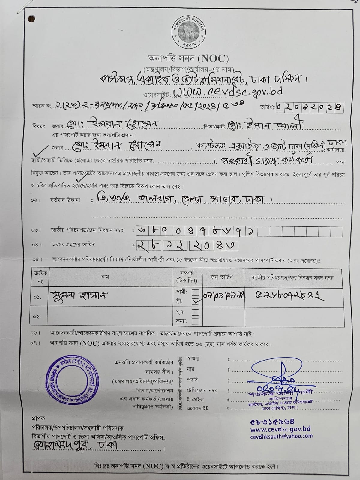 | 23 | অনাপত্তি পত্র (NOC) - জনাব মো: ইমরান হোসেন, সহকারী রাজস্ব কর্মকর্তা | 08-Sep-2024 |